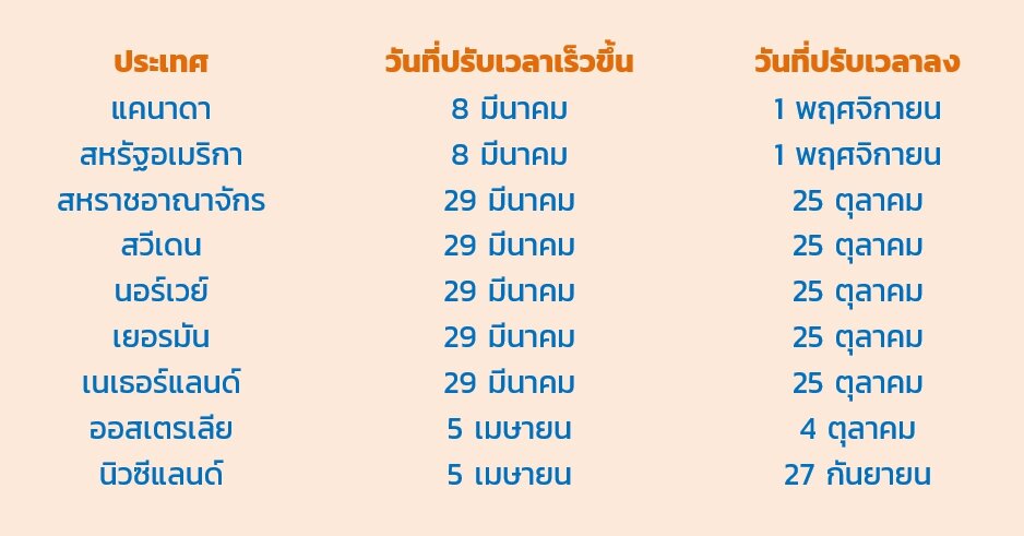 น้องๆ ทราบหรือไม่ว่า มีหลายๆ ประเทศในโลกนี้ที่มีการปรับเวลาให้เร็วขึ้นและช้าลง 2 ครั้งในแต่ละปี หรือที่เรียกว่า DAYLIGHT SAVING TIME โดยเฉพาะประเทศที่อยู่ในเขตเมืองหนาวหลายๆ ประเทศ เช่น สหราชอาณาจักร ประเทศต่างๆ ในยุโรป สหรัฐอเมริกา ออสเตรเลีย นิวซีแลนด์ เป็นต้น นั่นแปลว่าทุกๆ ปี คนในประเทศนี้ จะมีวันหนึ่งที่เวลานอนจะลดลง 1 ชั่วโมง และจะมีอีกวันหนึ่งของปีที่จะมีเวลานอนเพิ่มขึ้นอีก 1 ชั่วโมง ทำไมต้องปรับเวลา? ปรับเวลาแล้วมีผลยังไงกับเรา? ไปดูข้อมูลกันค่ะ